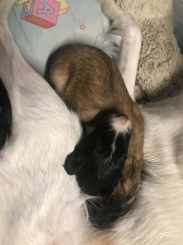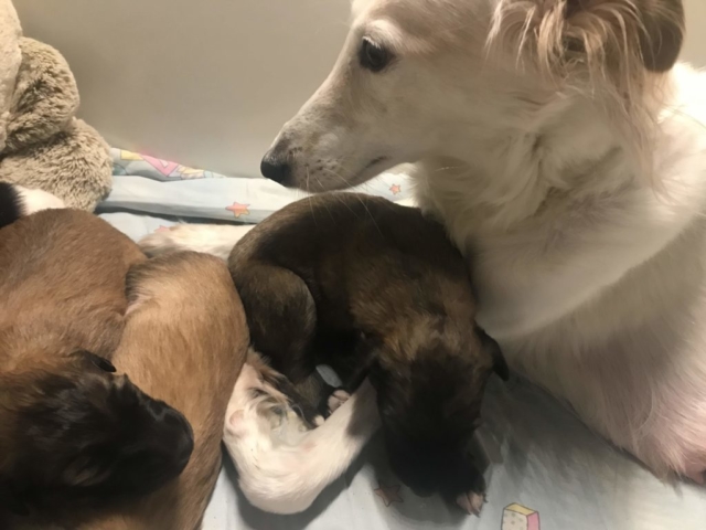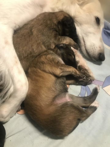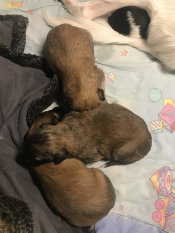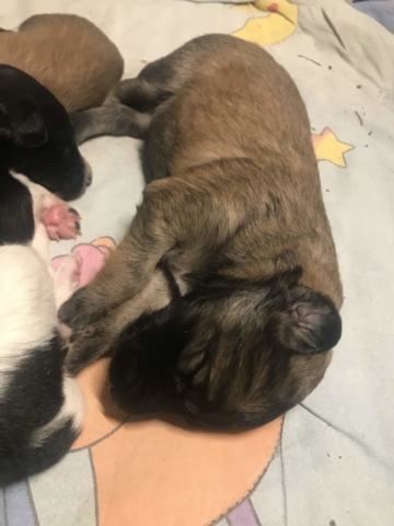 So, ich glaube jetzt fängt es so langsam an lustig zu werden. Die Augen gehen auf und die Ohren auch, das mit dem laufen sieht schon noch sehr merkwürdig aus, es ist meist ein rollen und umfallen. Der Bär, den sie gerne zum schlafen haben, wird erklettert und ich muss aufpassen, dass sie mir dabei nicht aus der Kiste krabbeln. Ihre Träume werden begleitet von knurren, laufen und bellen und wenn man sie am Hals krabbelt versuchen sie sich zu kratzen, es ist zu niedlich. Manchmal verirren sie sich in ihrer Kiste und dann kann man heulen wie ein Wolf aber ein sehr kleiner. Die erste Wurmkur haben sie brav geschluckt aber lecker ist was anderes. Ich muss ehrlich gestehen, die Wurfkiste steht da wo sonst um diese Zeit unser Weihnachtsbaum steht aber mir gefällt die Kiste viel besser, ein schönes Weihnachtsfest kann kommen, meine Geschenke habe ich schon.