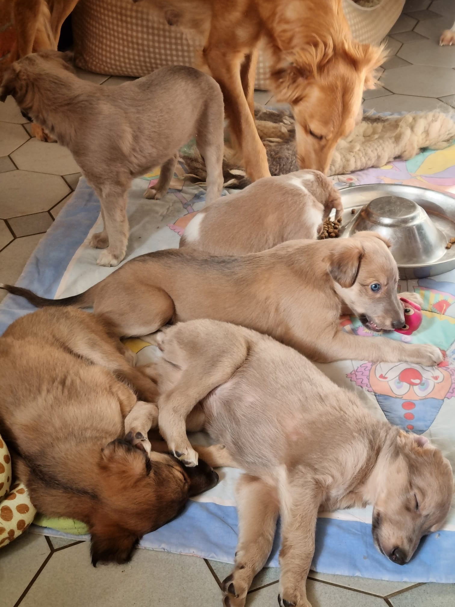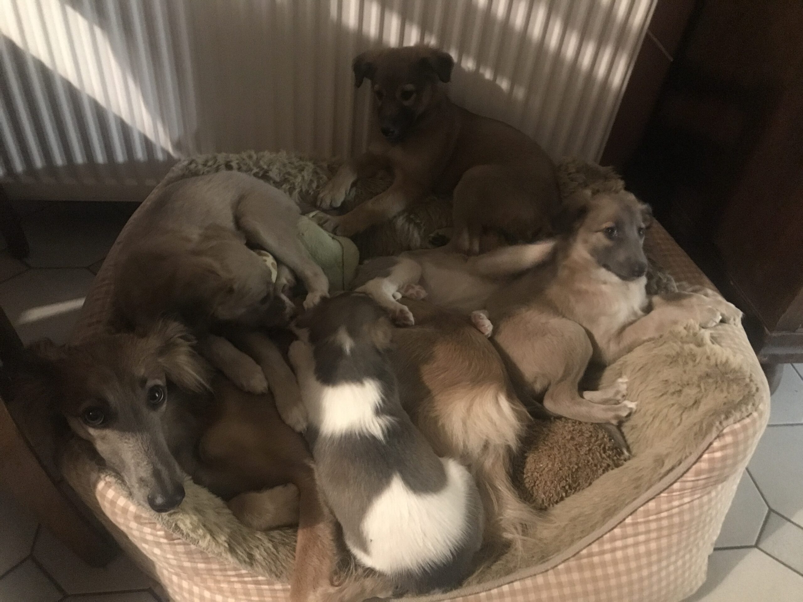 Die Woche des Karneval hat mit Konfetti begonnen. Ich habe keine Ahnung was sie für eine Party in der Nacht gefeiert haben aber Konfetti hat eine große Rolle gespielt oder vielleicht stand auch nur Mist in den Zeitungen, jedenfalls sah es am nächsten Morgen ziemlich zerfetzt in IHRER Bude aus. Als Zeitung konnte man nichts mehr erkennen. Aber das aller schönste ist abends das füttern. Zuerst mache ich das Futter für die Rambos, die bunte Bande und meine großen Schätze fertig. Das ist schon super aufregend und alle sitzen in der Küche und schauen zu, wird langsam was eng. Jetzt kommt der schwierige Teil, alles verteilen. Zuerst die Rambos wenn ich schnell bin und es geschickt anstelle, komme alle acht hinter mir her gerannt und die bunte Bande bekommt es nicht so schnell mit. Das ist der Idealfall ansonsten wird es hektisch bis die erste Türe zu ist und die Rambos fressen können. Die bunte Bande kommt mir dann meist schon entgegen weil die Nasen sie nicht täuschen und der Napf mit dem Fleisch gerade an ihnen vorüber gelaufen ist. Das zweite Abteil wird dann auch geschlossen und zum Schluss sind meine großen Schätze dran. Die Türe muss alle gut zu sein weil die Zwerge sie sonst einfach über den Haufen rennen würden uns alles klauen, was noch in den Näpfen ist. Die aller schönste Zeit ist die, zwischen Kacke wischen und aufräumen. Dann genießen wir alle die Sonnenstunden auf dem Reitplatz , im Sand oder sonst wo im Urwald um das Haus und das wird mir auch am meisten fehlen. Eigentlich wollte ich Prinzessin Frieda behalten aber das kann ich meinen großen Schätzen nicht antun. Sie haben ganz schön durch die Unruhe von 17 Hundekindern gelitten und sich tapfer geschlagen. Sie brauchen jetzt mal besondere Zuwendung. Ich bin froh so ein intaktes und doch in sich ruhendes Rudel zu haben. Meine Frieda Prinzessin wird wohl bei meiner Tochter einziehen und so habe ich immer noch was von ihr.