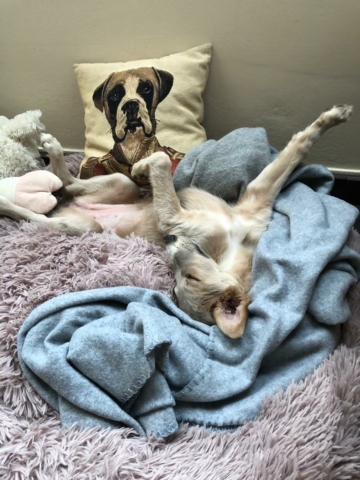 Sie war mein Seelenhund aus diesem Wurf und ich hätte wie Samt und Seide Frieda – jetzt Nomi – am liebsten behalten aber das hätten meine sechs großen Schätze nicht gut gefunden. Sie sind ziemlich gestresst von 17 Zwergen und haben keine Lust noch ein Hundekind zu erziehen. Glück im Unglück, sie ist zu meiner Tochter Anna und Aleks nach Leverkusen ins Bett gehüpft. Ihre Art und das super schönes Gesicht haben mich sofort in ihren Bann gezogen. Immer lustig, trotzdem vornehm zurückhaltend und für jeden Blödsinn zu haben, sprich; ordentlich Hummeln im Hintern, ein Schatz genau für mich !! Jetzt wird sie dort den Haushalt mal ein bisschen aufmischen und ich werde sie wohl immer mal wieder sehen, was mich sehr freut und vielleicht darf ich auch in zwei bis drei Jahren einen Wurf daraus ziehen. Mal sehen was die Zeit so bringt.