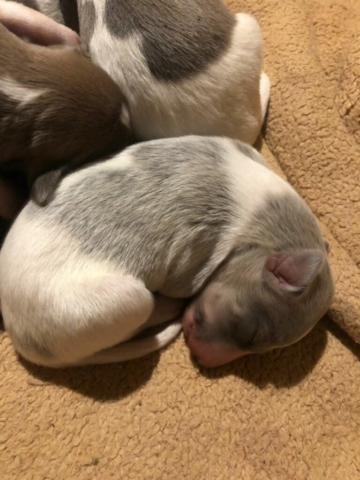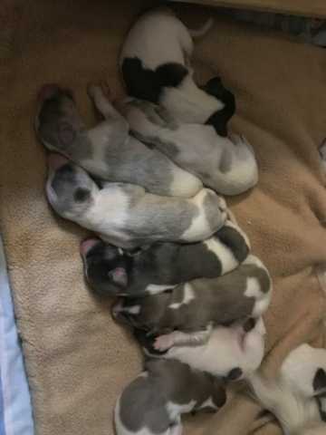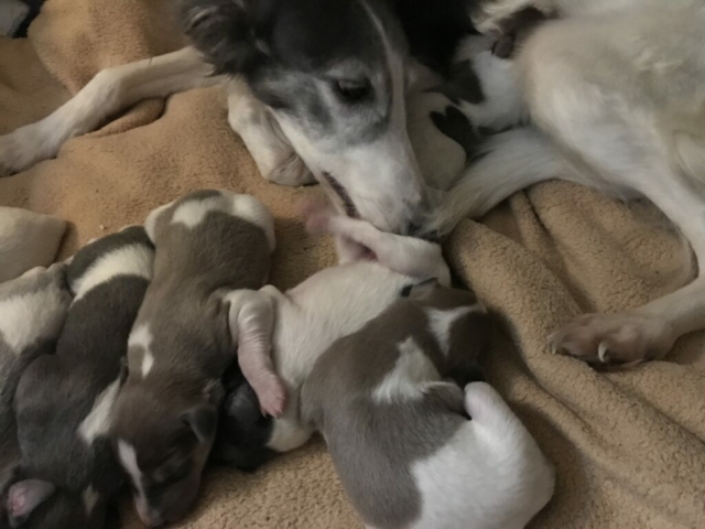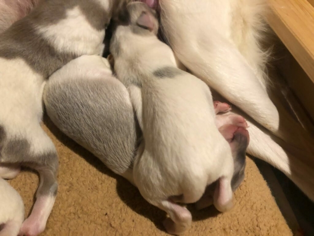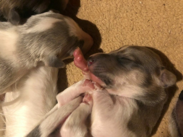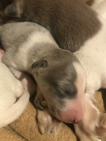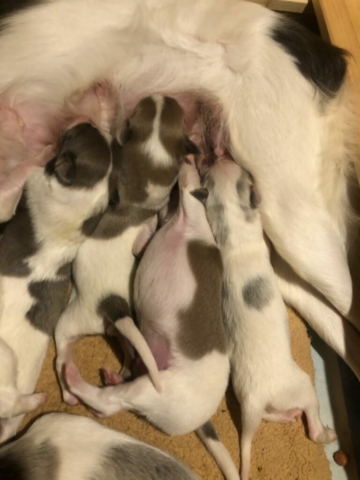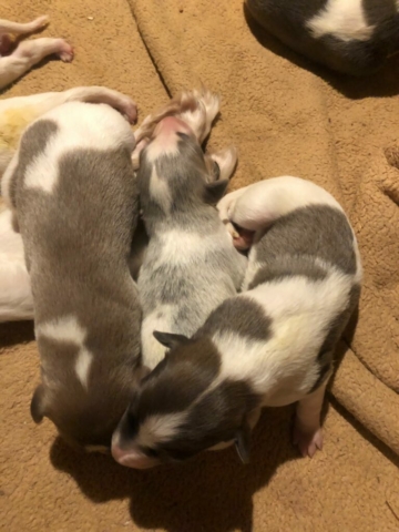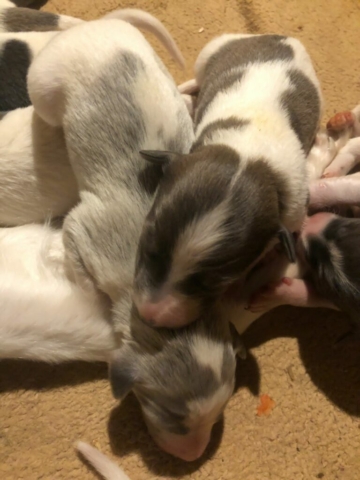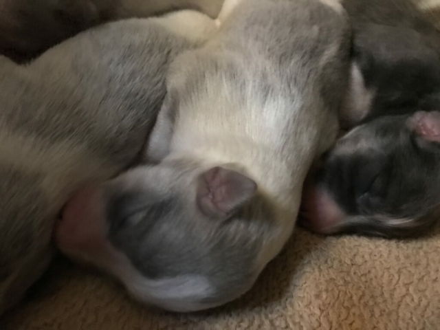 Heute sind die kleinen dicken Schätze zwei Wochen alt und haben ordentlich zugenommen. Die Woche hat eigentlich ganz nett angefangen und zum Ende gab es dann die erste Wurmkur, rosa und ekelig !!!! Auf die Waage bringen sie schon ordentlich Gewicht der kleinste 950g und die dickste 1200g, ich glaube das werden dicke Windhunde, auch lustig. Die Augen sind bei fast allen vollständig auf und sie sind schon recht flott unterwegs. Ich denke in einer Woche werde ich die Wohnung erweitern müssen. Irgendwie habe ich etwas Respekt bei 17 kleinen Flitzern aber ich freue mich auch drauf wenn sie im Stroh spielen können.