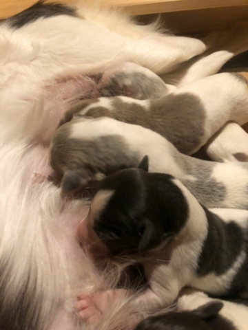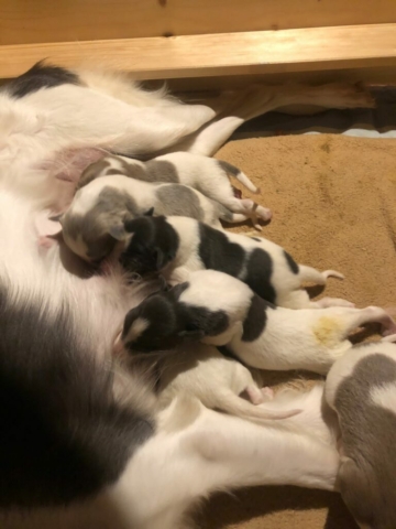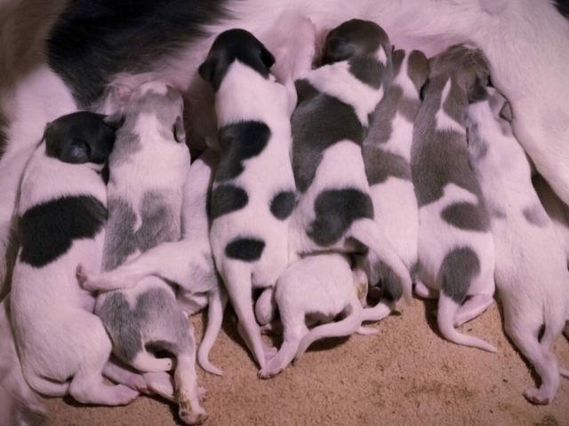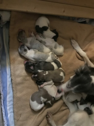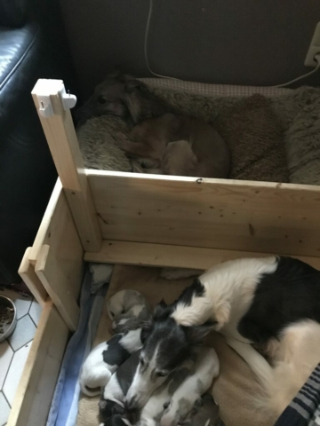 Auch bei den Neunlingen ist die erste Woche rum und sie sind alle gesund und munter, haben ordentlich zugenommen und das meckern wird auch schon lauter. Sie liegen allerdings noch mehr zusammen wie es bei den größeren war, sind aber agil und krabbeln durch die Kiste, immer in Richtung Milchbar. Millie ist eine eher altmodische Mama, sie ist erst vor zwei Tagen das erste Mal mit gegangen die Schafe zur Weide bringen und hockt auch viel mehr in der Wurfkiste als es Hedda getan hat. Dafür hat Millie und ihre bunte Bande einen eigenen Bodyguard mit Namen Jette. Sie passt auf alles auf was um die Kiste herum passiert und schreitet ein wenn sie meint es ist nicht richtig. Es ist zu schön wie sie alle aufeinander aufpassen.