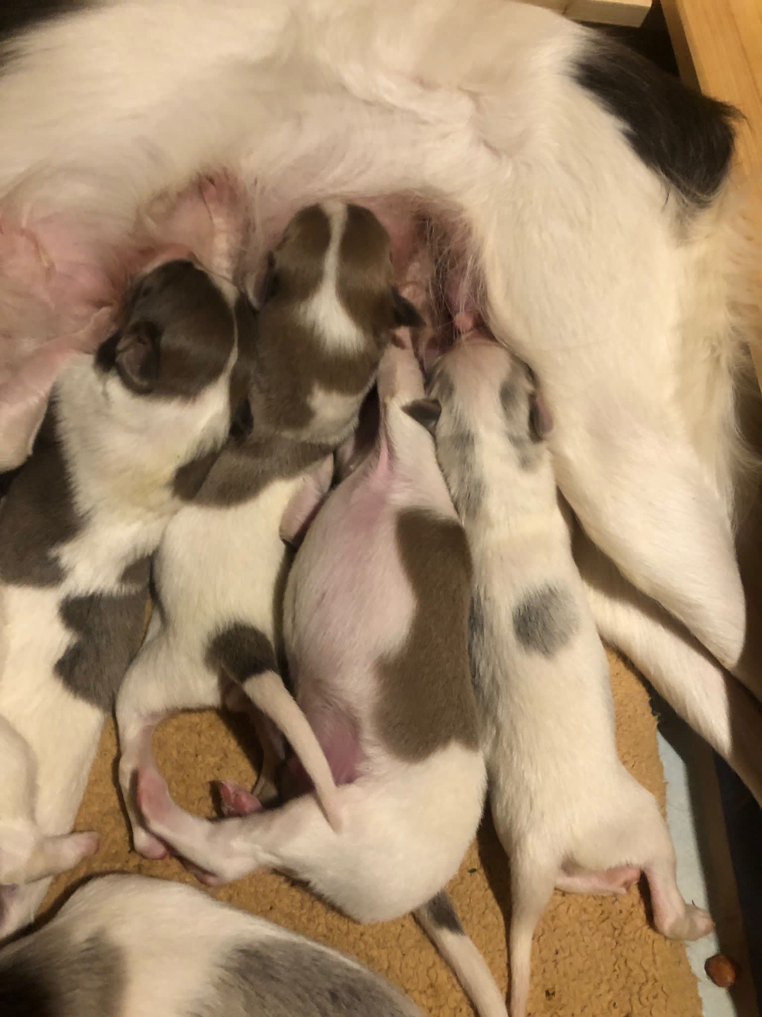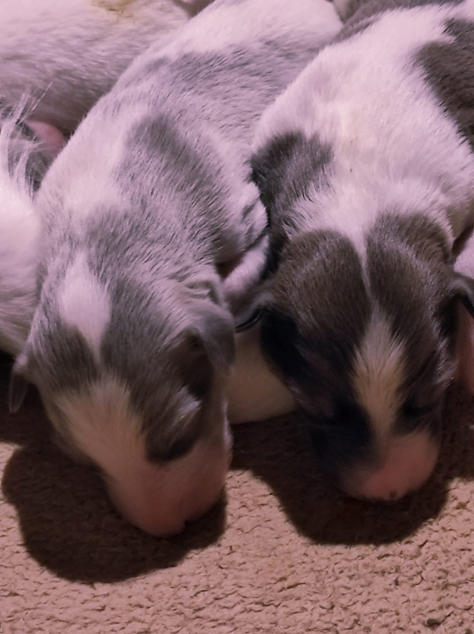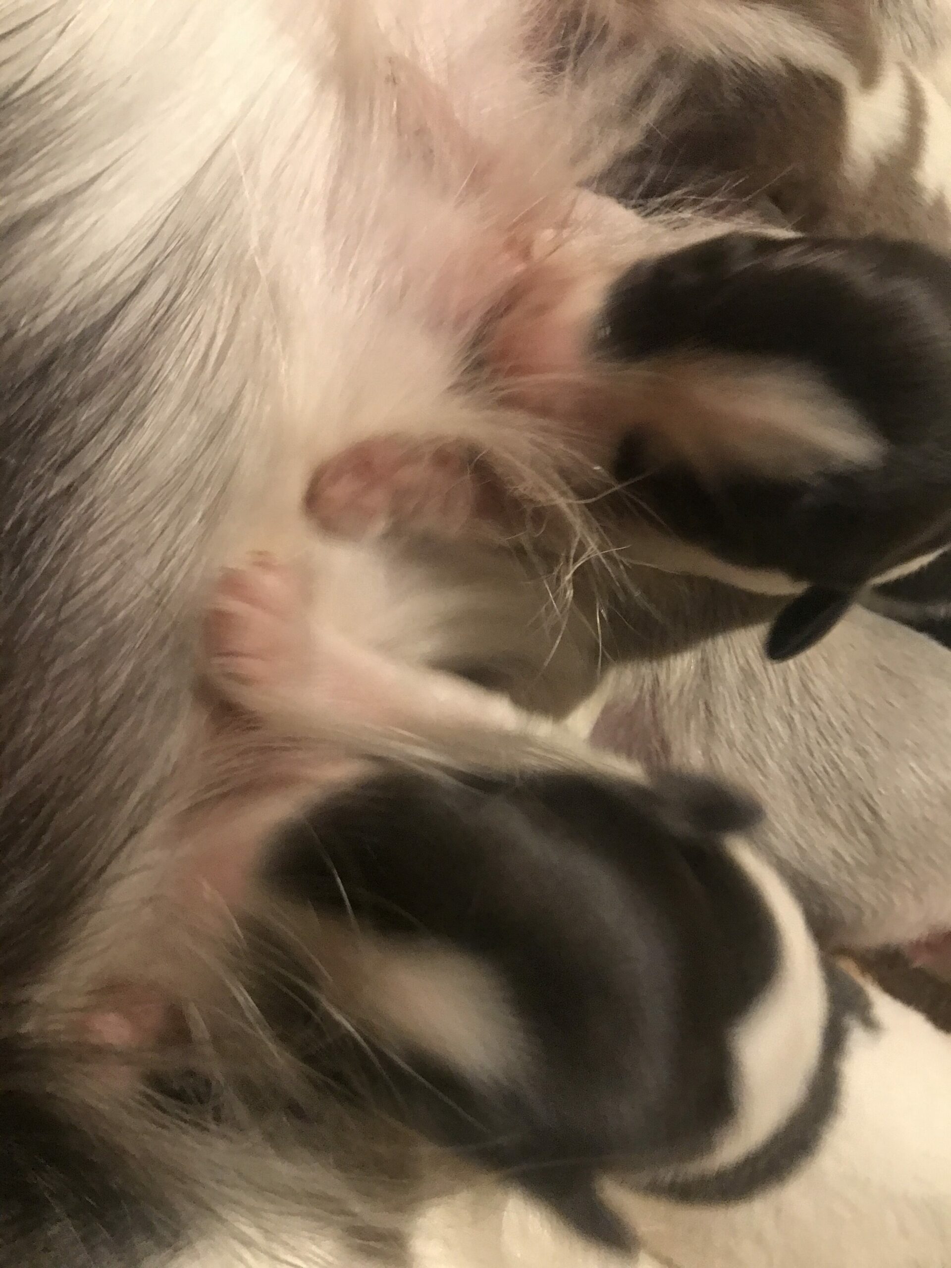 Auch bei den Neunlingen ist die erste Woche rum und sie sind alle gesund und munter, haben ordentlich zugenommen und das meckern wird auch schon lauter. Sie liegen allerdings noch mehr zusammen wie es bei den größeren war, sind aber agil und krabbeln durch die Kiste, immer in Richtung Milchbar. Millie ist eine eher altmodische Mama, sie ist erst vor zwei Tagen das erste Mal mit gegangen die Schafe zur Weide bringen und hockt auch viel mehr in der Wurfkiste als es Hedda getan hat. Dafür hat Millie und ihre bunte Bande einen eigenen Bodyguard mit Namen Jette. Sie passt auf alles auf was um die Kiste herum passiert und schreitet ein wenn sie meint es ist nicht richtig. Es ist zu schön wie sie alle aufeinander aufpassen.