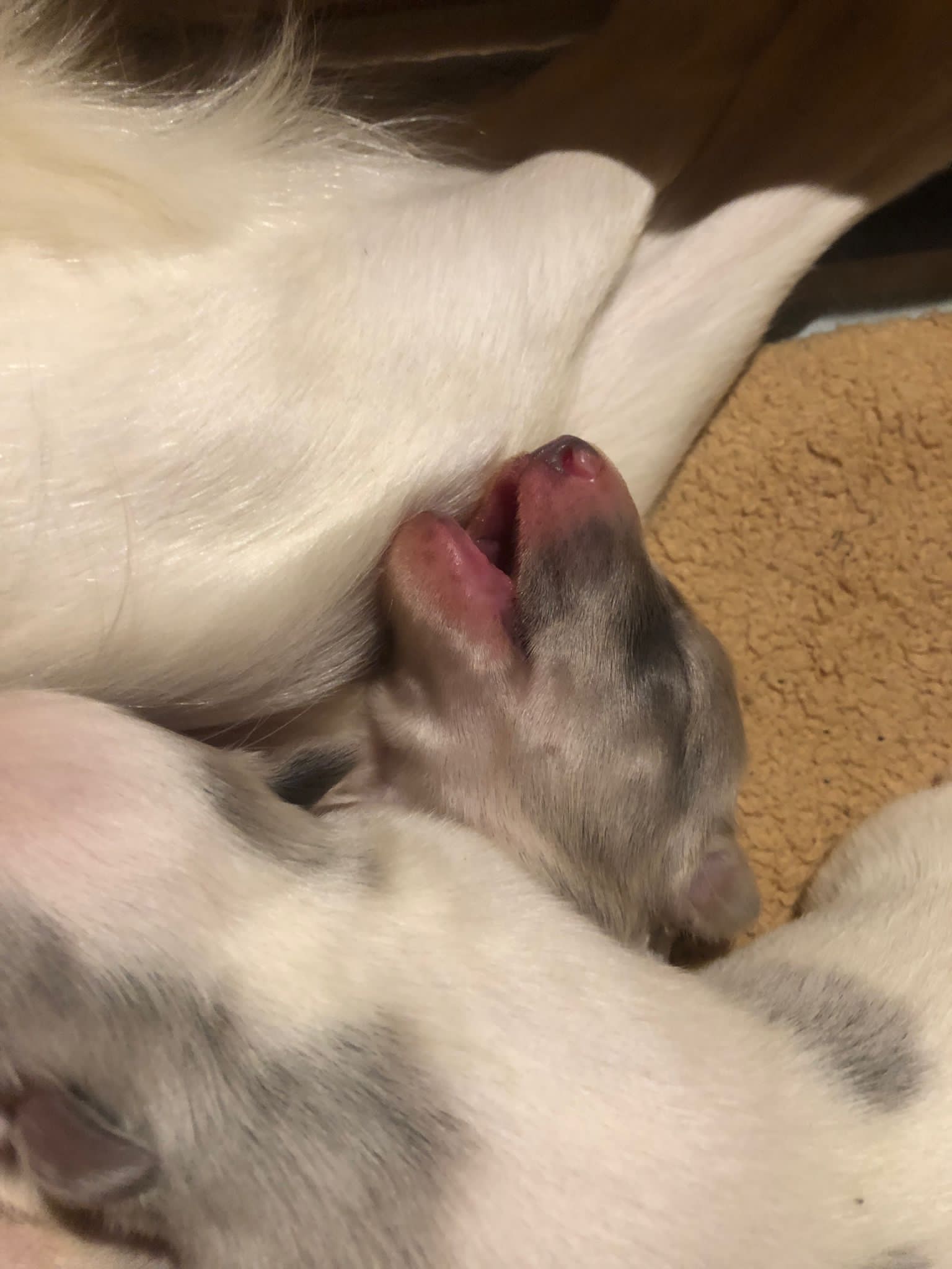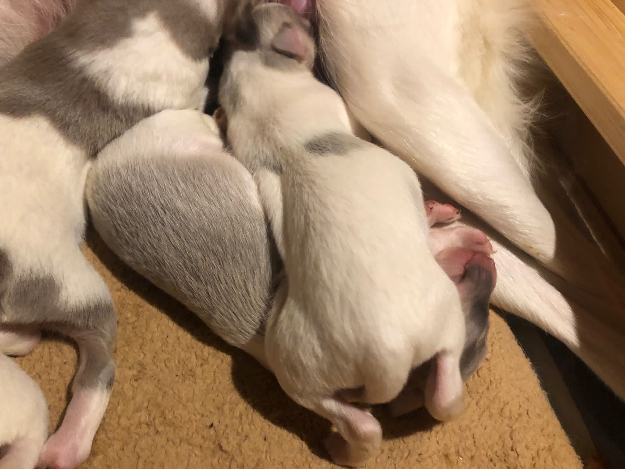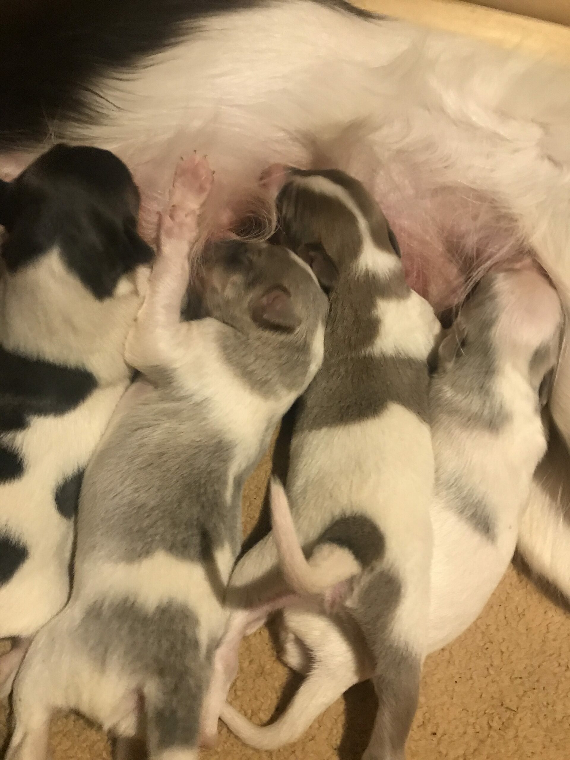 Auch bei den Neunlingen ist die erste Woche rum und sie sind alle gesund und munter, haben ordentlich zugenommen und das meckern wird auch schon lauter. Sie liegen allerdings noch mehr zusammen wie es bei den größeren war, sind aber agil und krabbeln durch die Kiste, immer in Richtung Milchbar. Millie ist eine eher altmodische Mama, sie ist erst vor zwei Tagen das erste Mal mit gegangen die Schafe zur Weide bringen und hockt auch viel mehr in der Wurfkiste als es Hedda getan hat. Dafür hat Millie und ihre bunte Bande einen eigenen Bodyguard mit Namen Jette. Sie passt auf alles auf was um die Kiste herum passiert und schreitet ein wenn sie meint es ist nicht richtig. Es ist zu schön wie sie alle aufeinander aufpassen.