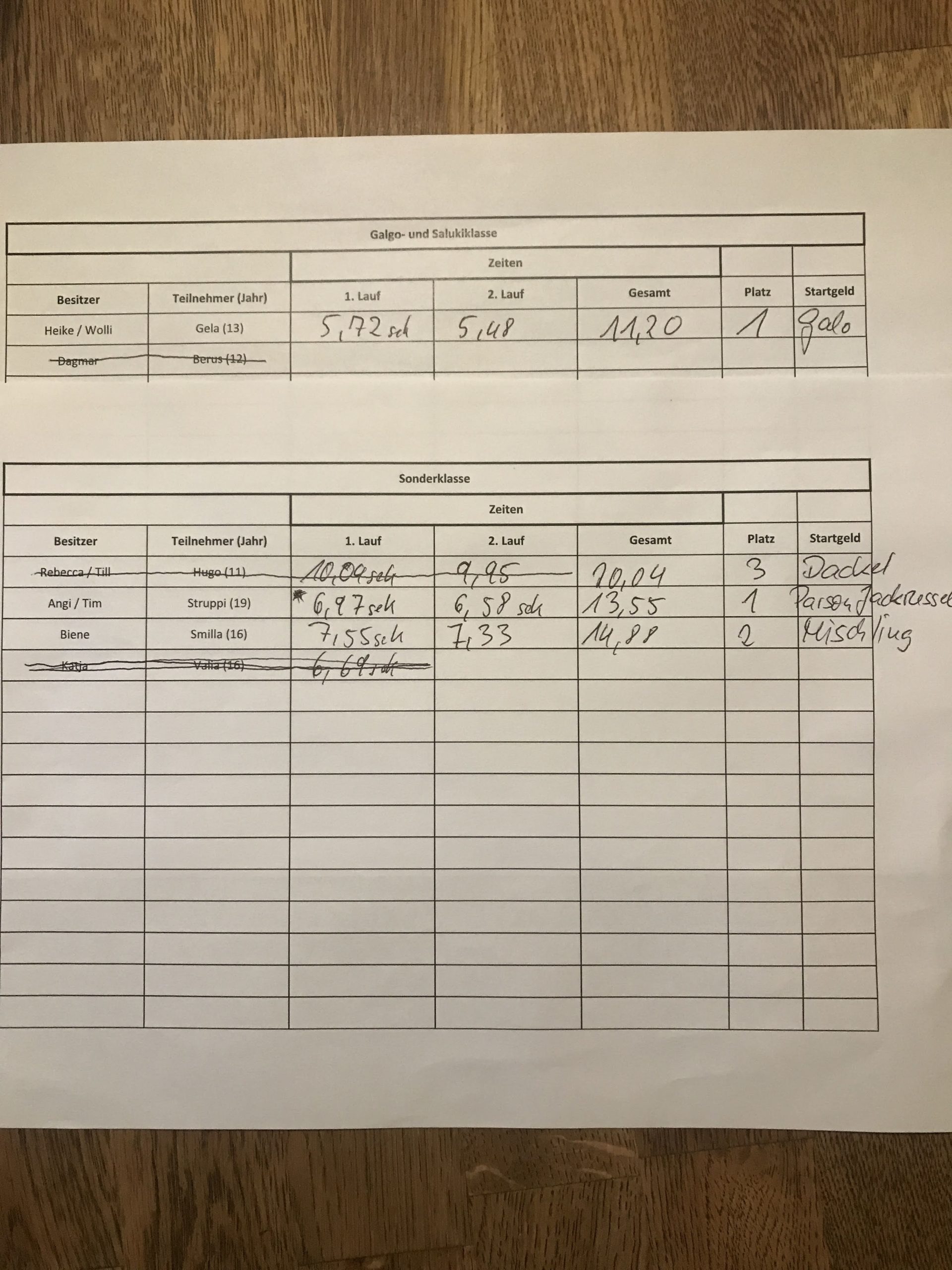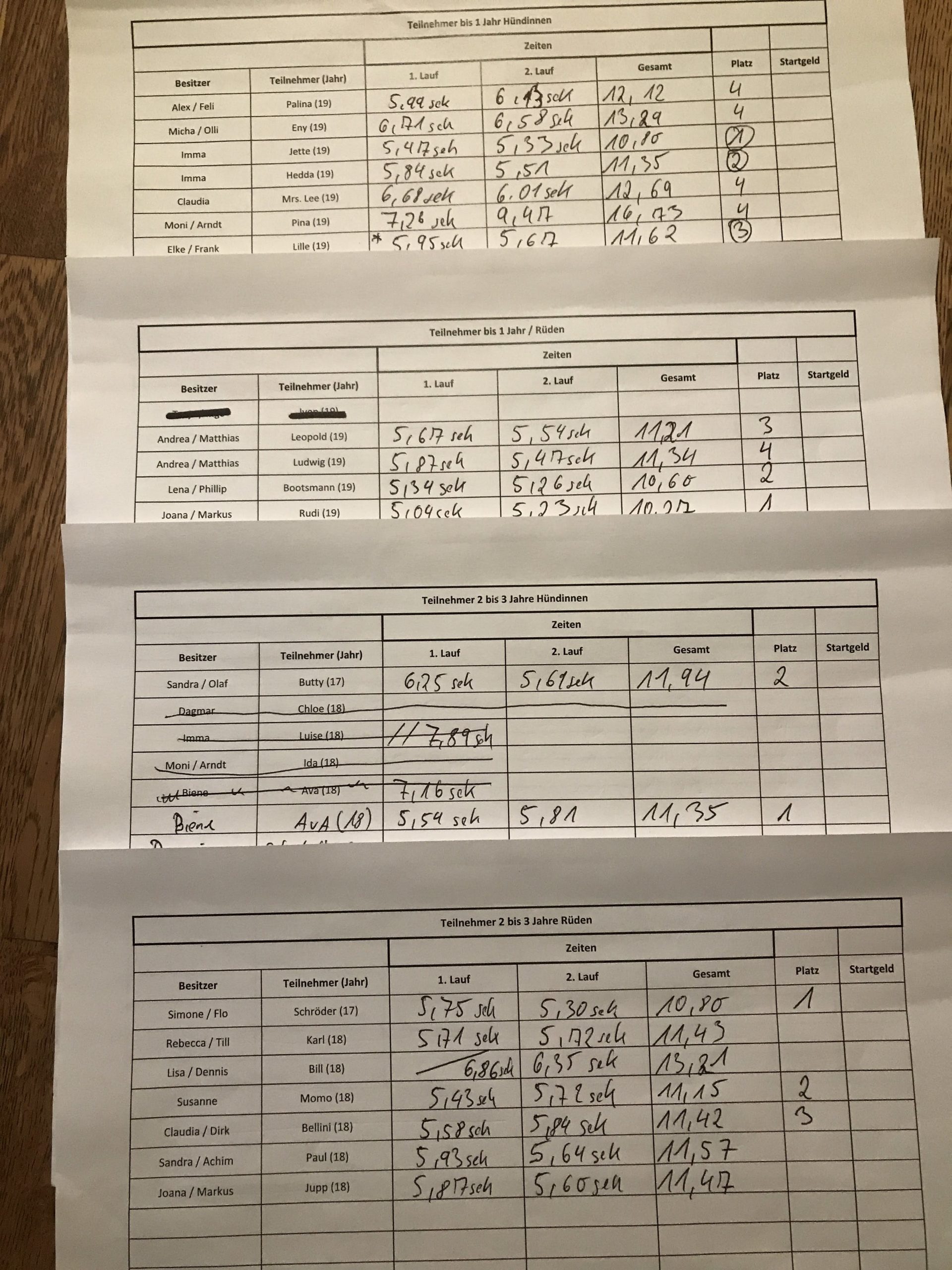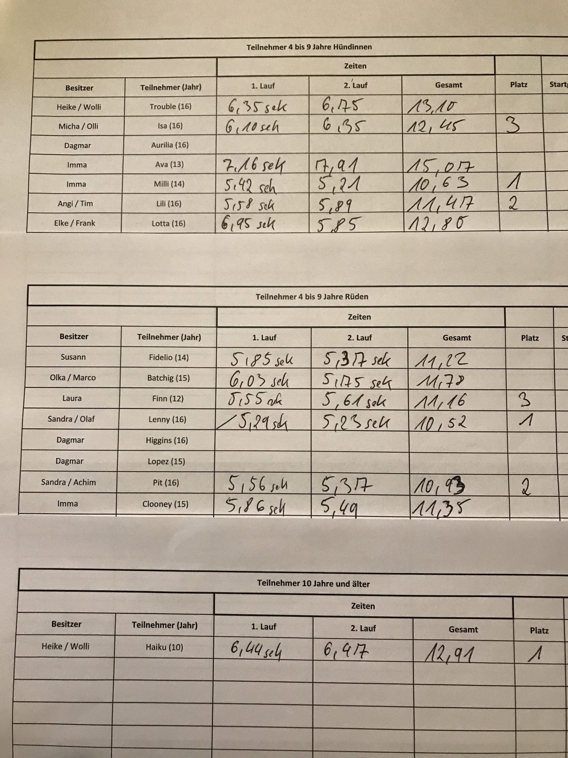 Gesamtsieger Rüden wie Samt und Seide „Rudi“ 60mtr. in 5,04 Sek. Gesamtsieger Hündinnen wie Samt und Seide „Millie Blue“ 60mtr. 5,21 Sek. Millie ist die Mutter von Rudi, beide hatten eine Geschwindigkeit von 41 km/h ich finde für untrainierte Hunde ist das eine tolle Leistung
