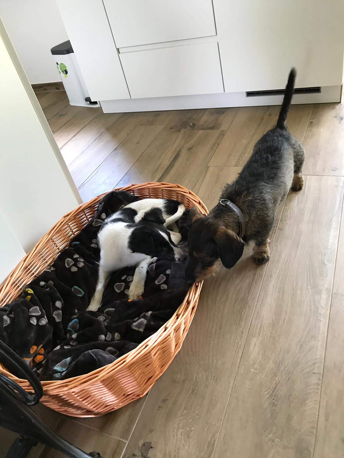 wie Samt und Seide „Karl“ hat mit drei weiteren Geschwistern am 6.Juli die Reise in ein neues Zuhause angetreten. Rebecca, Till und Fiete mit Dackel Hugo aus Wermelskirchen haben ein Stück Sofa und ein Stück Kinderwagen frei geräumt für den Einzug. Eigentlich sollten nicht so viele auf einmal gehen aber für meine Schätze wurde es Zeit in ein neues Zuhause zu kommen um genügend Schmuseeinheiten zu bekommen. Karl durfte sich schon in der letzten Woche an seinen neuen Dackelfreund Hugo gewöhnen und hatte ihn sofort im Griff. Mein kleiner dicker Karl war einer der lustigsten und größten und immer zu einer Rauferei bereit. Trostpflaster, ich werde ihn ziemlich oft sehen, seine neue Erziehungsberechtigte hat ein Pferd bei mir in Pension.