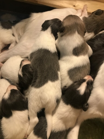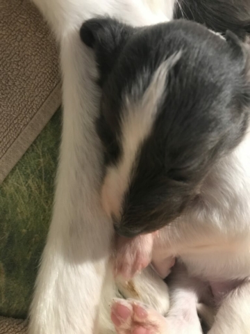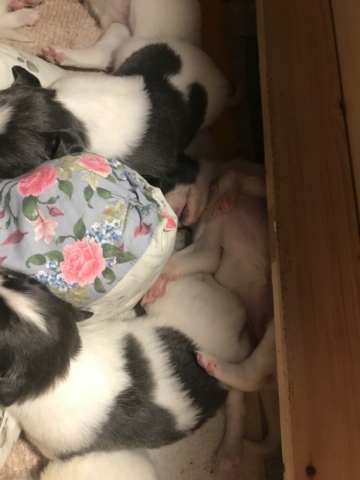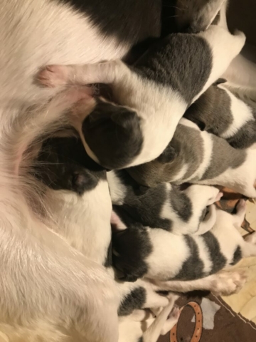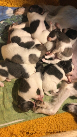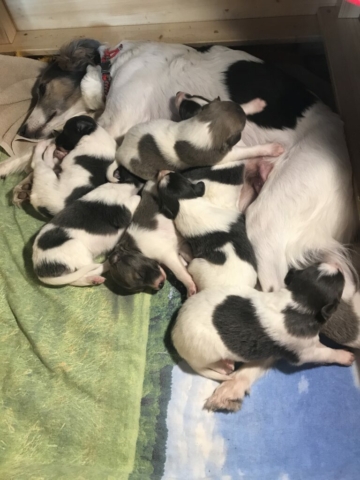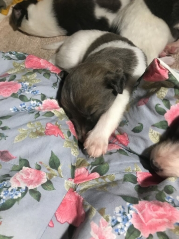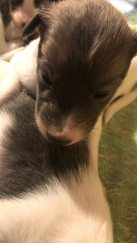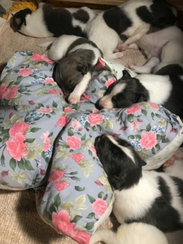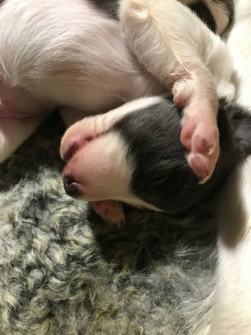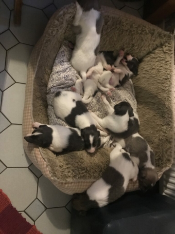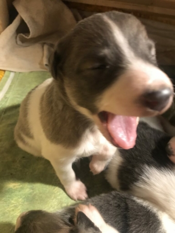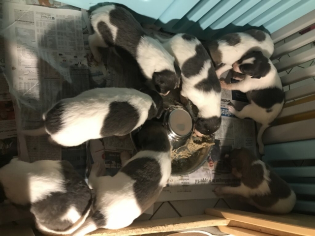 In der letzten Woche ist viel geschehen, die Augen sind auf und sie hören zu wenn man mit den ihnen spricht. Das raufen geht viel besser und am Schwanz festhalten klappt. So einfach entkommt keiner mehr und die Geräuschkulisse wird heftiger, bellen knurren aber auch mal jammern. Vor allem wird heftigst geträumt. In den Träumen sind sie auf der Flucht oder auf der Rennbahn unterwegs, die Beine sind immer in Bewegung. Sie wiegen jetzt zwischen 1045g und 1250g, mussten alle auf die Waage, die erste Wurmkur war fällig aber nicht so super lecker. Egal, muss sein. Woche vier kann kommen, ich habe schon die Wohnung erweitert und feste Nahrung hat es heute das erste Mal gegeben.