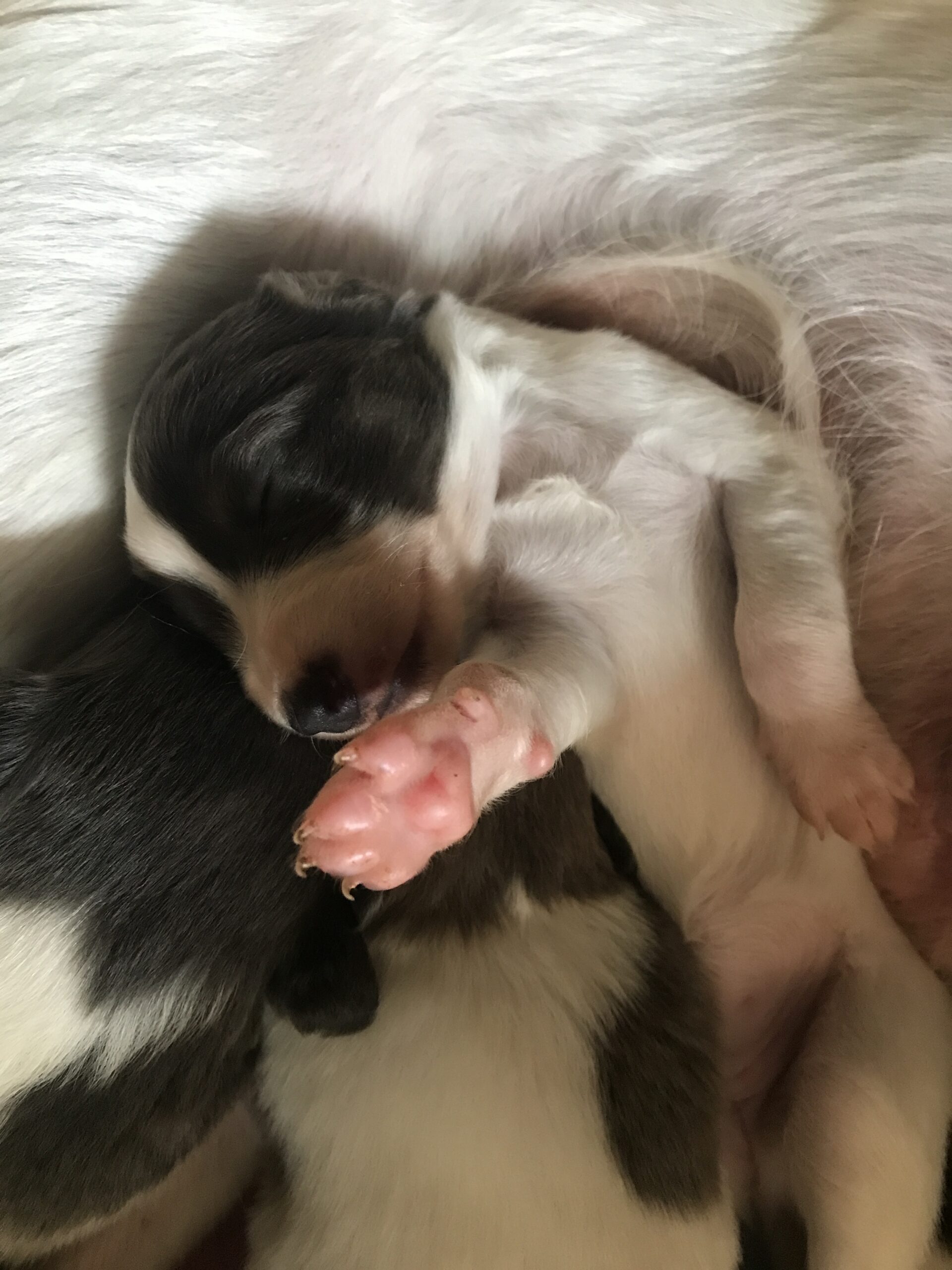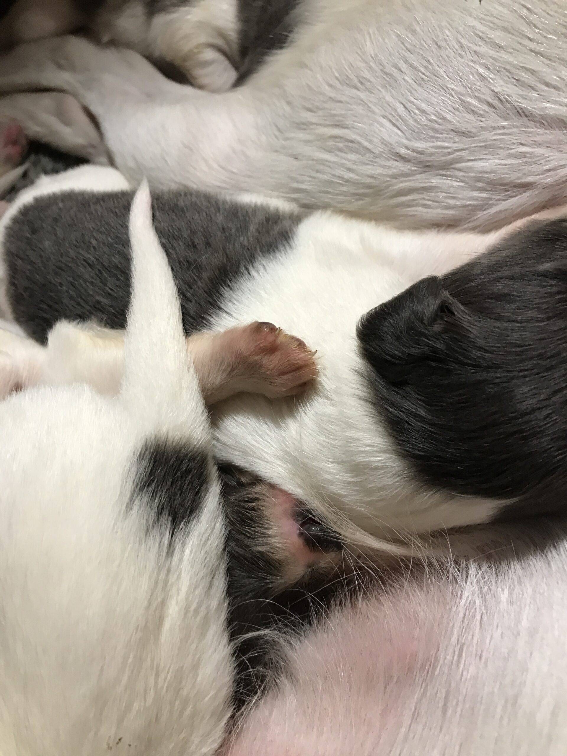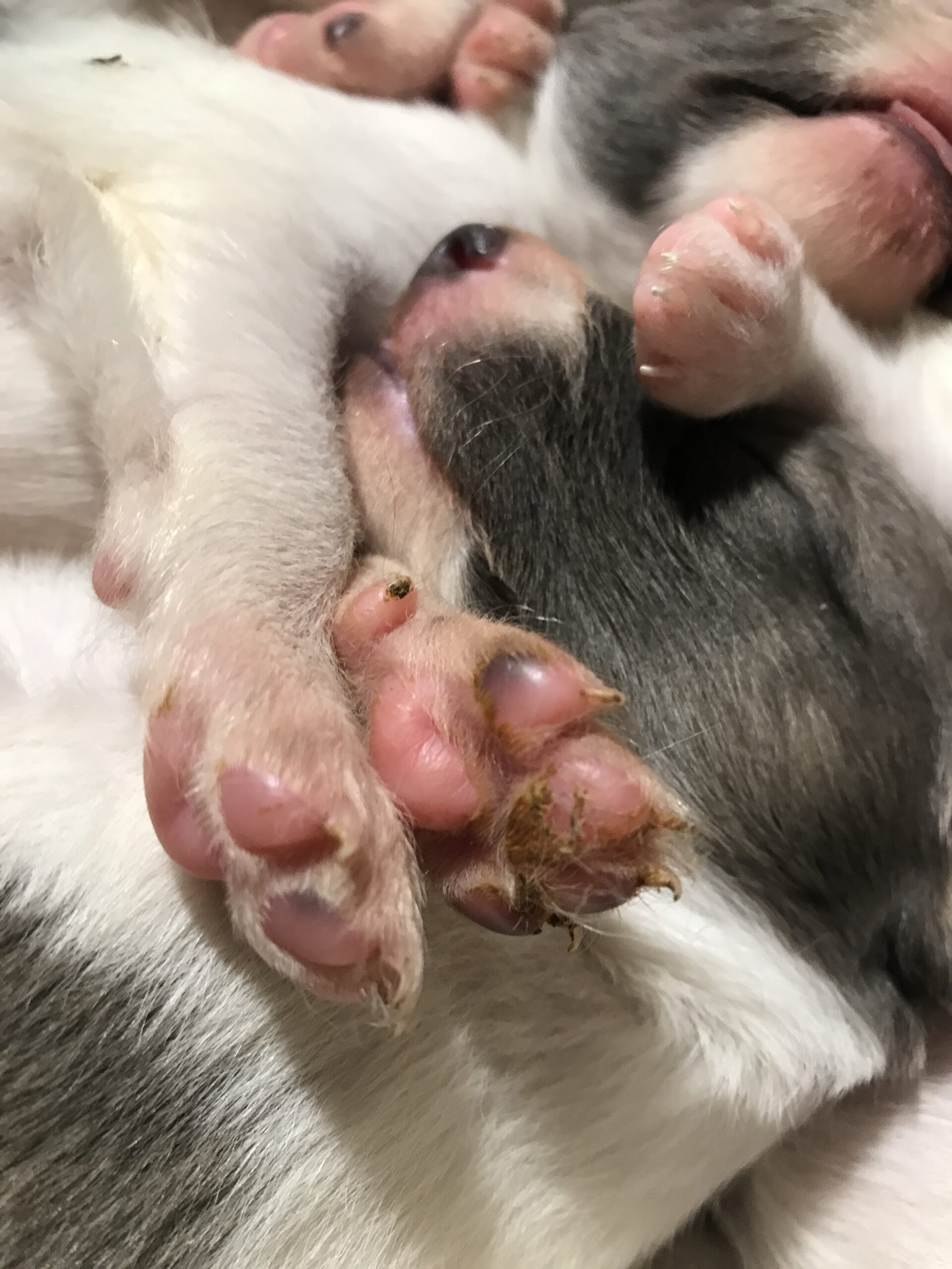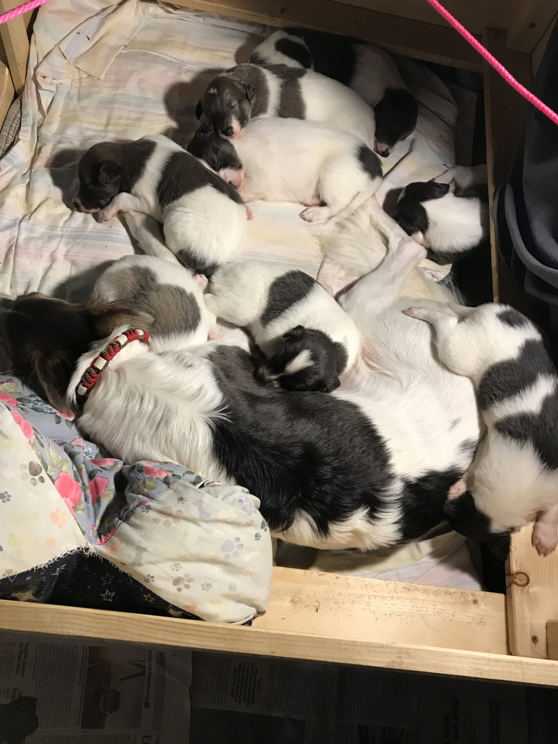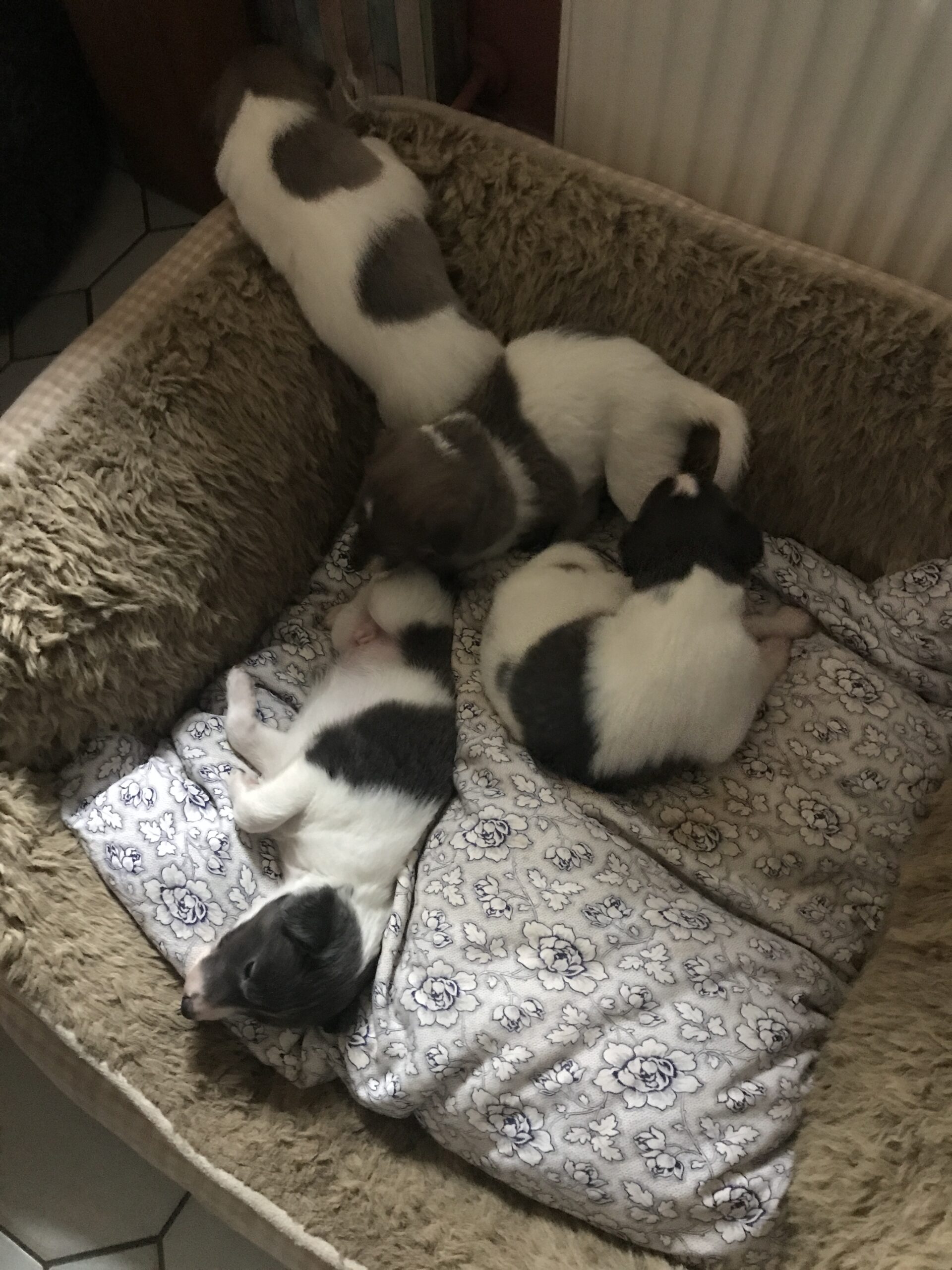 In der letzten Woche ist viel geschehen, die Augen sind auf und sie hören zu wenn man mit den ihnen spricht. Das raufen geht viel besser und am Schwanz festhalten klappt. So einfach entkommt keiner mehr und die Geräuschkulisse wird heftiger, bellen knurren aber auch mal jammern. Vor allem wird heftigst geträumt. In den Träumen sind sie auf der Flucht oder auf der Rennbahn unterwegs, die Beine sind immer in Bewegung. Sie wiegen jetzt zwischen 1045g und 1250g, mussten alle auf die Waage, die erste Wurmkur war fällig aber nicht so super lecker. Egal, muss sein. Woche vier kann kommen, ich habe schon die Wohnung erweitert und feste Nahrung hat es heute das erste Mal gegeben.